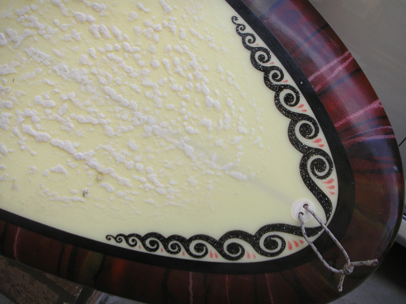 デッキのノーズとテイルに手の込んだ樹脂アートが施されています。