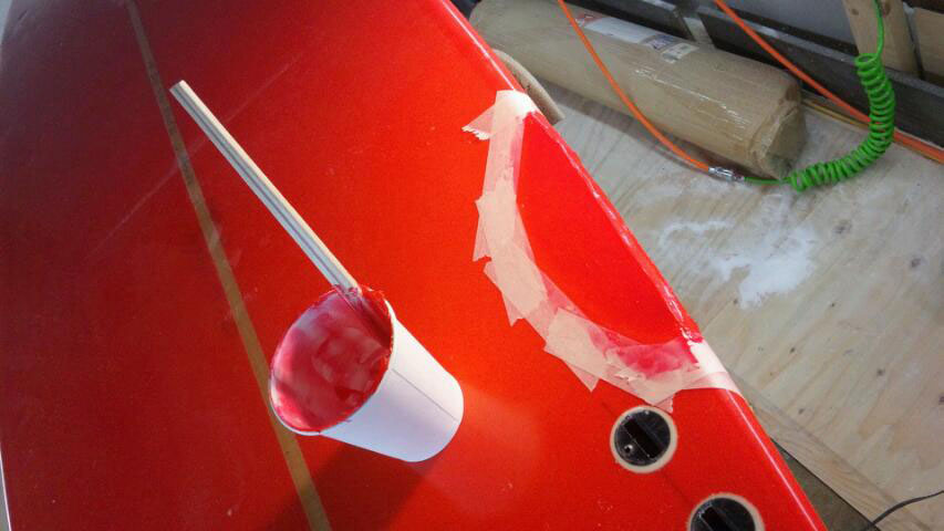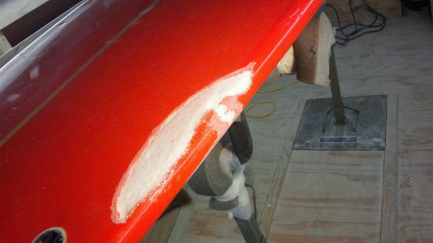 ストリンガー右側が欠けたノーズの修理。まだ新しい板なのでパテ埋めを白着色と透明の2段階で丁寧にやってます。(安く上げたい場合は樹脂埋めのみで)