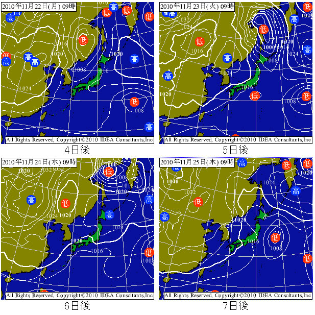 次の西高東低は来週の火曜あたりという週間予想気圧配置。