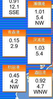 深浦と酒田では波高が上がっているので、北ウネリが秋田沖を走ってます。