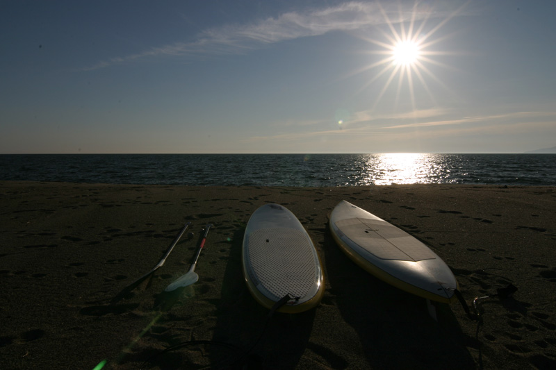 私は12’のレース用を試してみました。1時間くらいパドルしましたが運動量は波乗りのパドリング以上で全身を使いなかなかハードです。