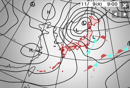 明日は停滞気味の低気圧が日本海にあって北東進して来ます。すでに沖は南西が吹いてますが沿岸は南東オフの時間帯もありそうです。明日の夜には西高東低の気圧配置に。