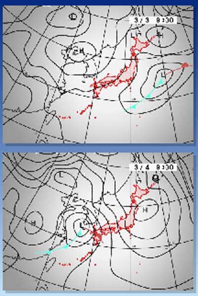 明後日は高気圧がやってきて秋田上空は高気圧の西側のヘリなので南東の風。