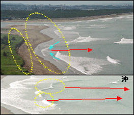 サーファーはその沖へ流れるカレントを利用して楽にパドルアウトします。