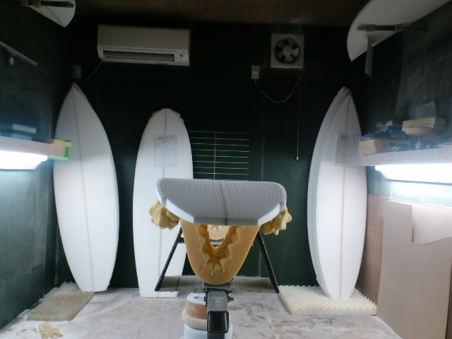 ショートボードがメインのインスパイア サーフボード。ここの工場では国内ブランドのff_ファイバーフレックスのラミネーションをすべてやっています。