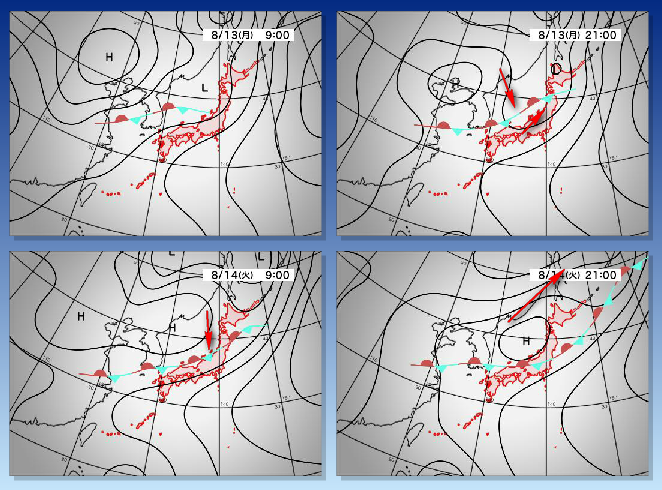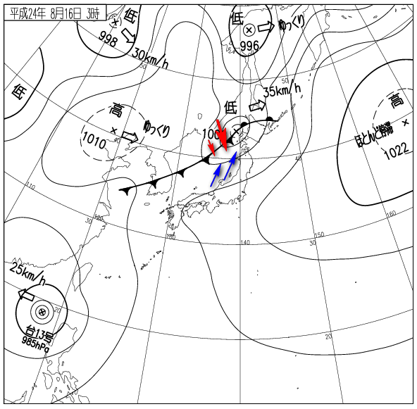 明日の朝には↑の先の赤丸の位置まで進みますから、南西と北西のウネリが混在しそうです。