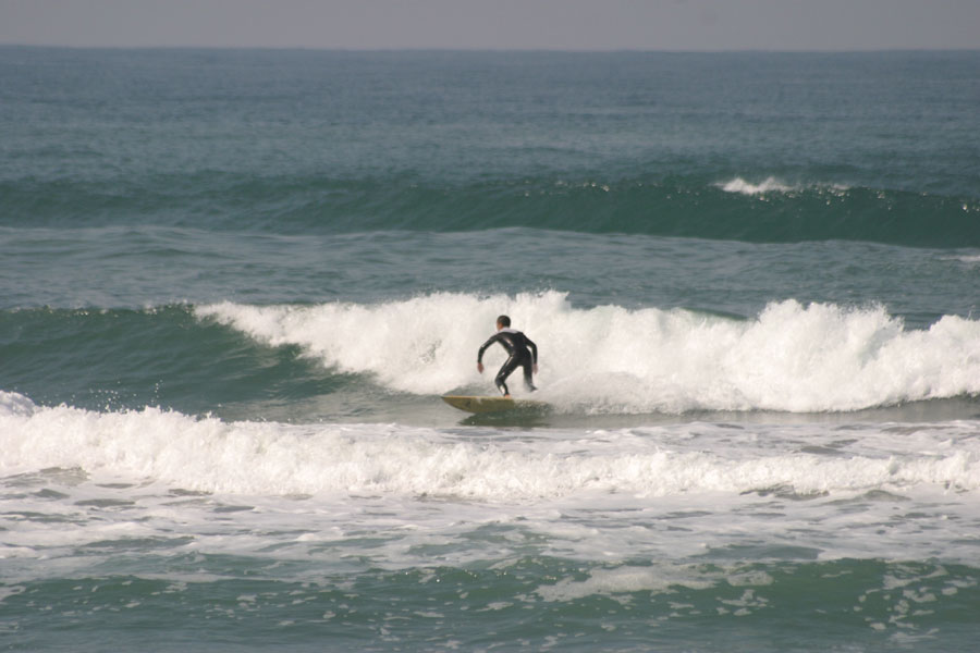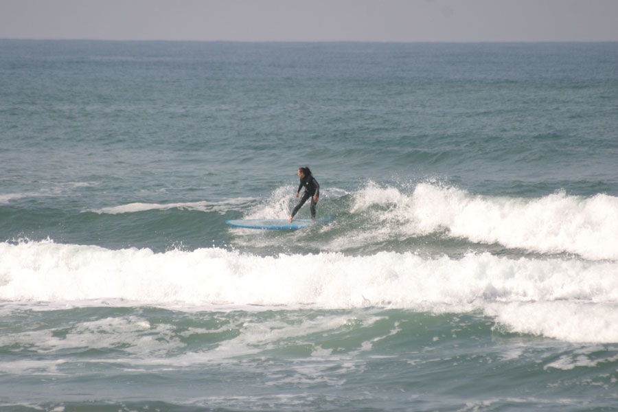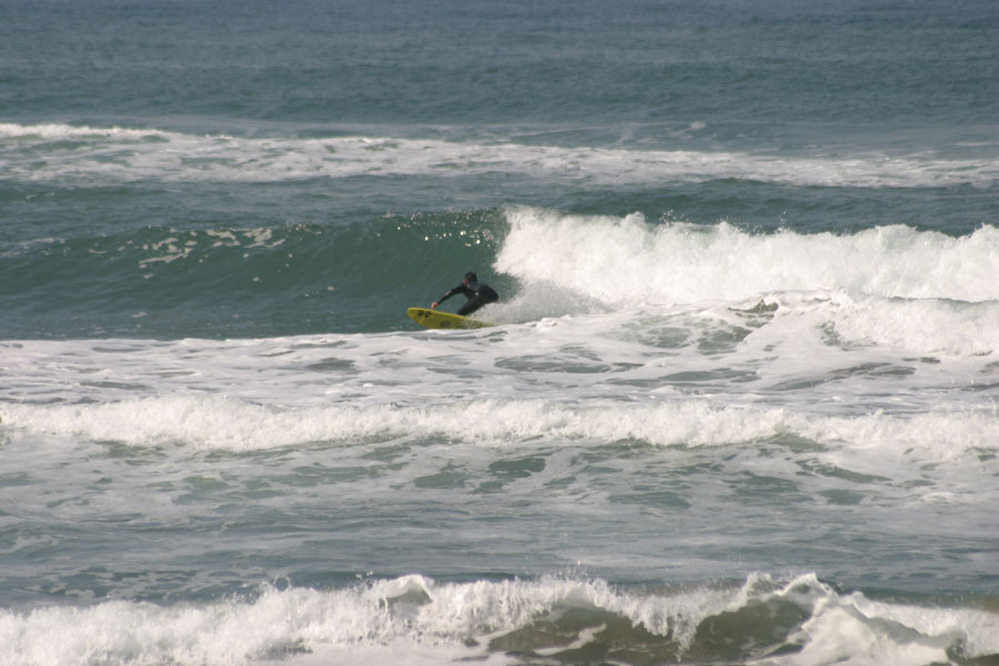 試乗した日は弱いオンショアでややまとまってきたかなというコンディション。波は厚めの腹胸~肩+。